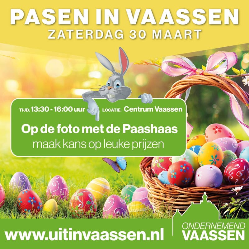 Tijdens het knutselen loopt er in het centrum van Vaassen een Paashaas rond die paaseitjes uitdeelt en waarmee de kinderen op de foto kunnen. Deze fotoโs worden