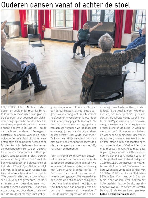 Dansen vanaf je Stoel (of erachter) is een heerlijke activiteit voor ouderen die weer lekker willen bewegen op muziek. Muziek stimuleert de hersenen en in combinatie met dansbewegingen geeft dit de hele dag een prettig gevoel. Het activeert en stimuleert. Dansdocente Juliette Nieboer heeft ruime ervaring met danslessen op het juiste niveau. 'Niets is fout, je beweegt zo mooi en zo goed als je kunt!'