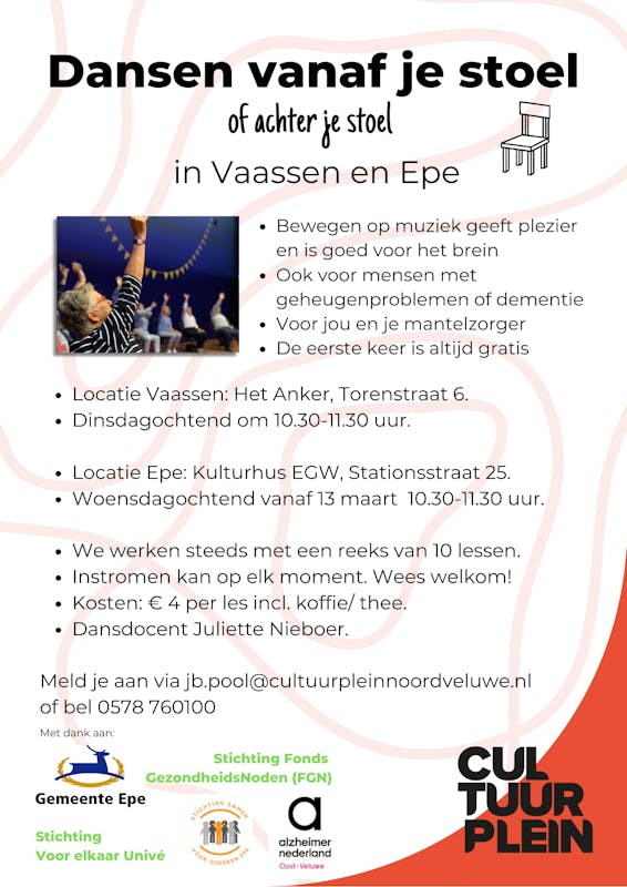 Dansen vanaf je Stoel (of erachter) is een heerlijke activiteit voor ouderen die weer lekker willen bewegen op muziek. Muziek stimuleert de hersenen en in combinatie met dansbewegingen geeft dit de hele dag een prettig gevoel. Het activeert en stimuleert. Dansdocente Juliette Nieboer heeft ruime ervaring met danslessen op het juiste niveau. 'Niets is fout, je beweegt zo mooi en zo goed als je kunt!'