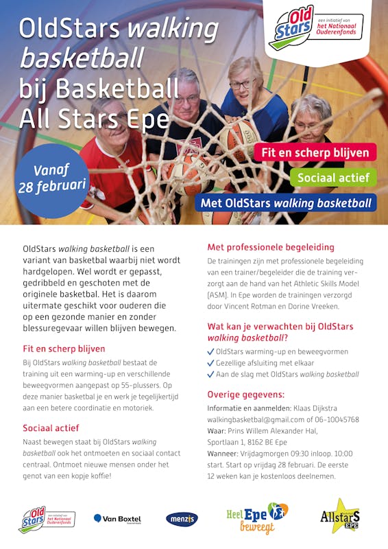 OldStars walking basketball is een variant van basketbal, waarbij niet wordt hardgelopen maar wel wordt gepasst, gedribbeld en geschoten met de originele basketbal. Het is daarom uitermate geschikt voor mensen die op een gezonde manier en zonder blessuregevaar willen blijven bewegen. Basketbal is een teamsport en dat maakt ook deze variant zo leuk: het sociale contact is namelijk net zo belangrijk als het bewegen. In principe kan iedereen meedoen, maar het richt zich voornamelijk op de leeftijdsgroep 55+. OldStars walking basketball is onderdeel van OldStars Sport (project van het Nationaal Ouderenfonds). Dit is een verzameling van aangepaste spelvormen, zoals ook OldStars walking football, OldStars walking hockey, OldStars walking handball e.a. Met dit uitgebreide OldStars aanbod maakt het Ouderenfonds met onder andere partners Menzis en Van Boxtel volgende stap in de landelijke ontwikkeling van de 100% ouderenvriendelijke sportvereniging. Hierbij staan gezond en fit blijven én socialisatie in en rondom de sportvereniging centraal. Inmiddels doen er al 335 amateurverenigingen mee in Nederland en wij willen samen met elkaar het succes nog groter maken!