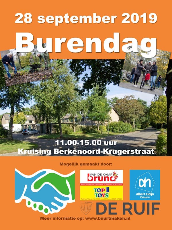 Dit jaar vieren we burendag in de wijk Berkenoord op de kruising van Berkenoord met de Krugerstraat.