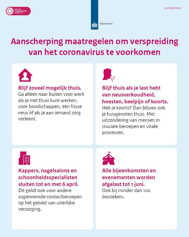 Eerder afgekondigde maatregelen blijven van kracht. Kijk op de pagina over de aanpak van het coronavirus voor meer informatie.