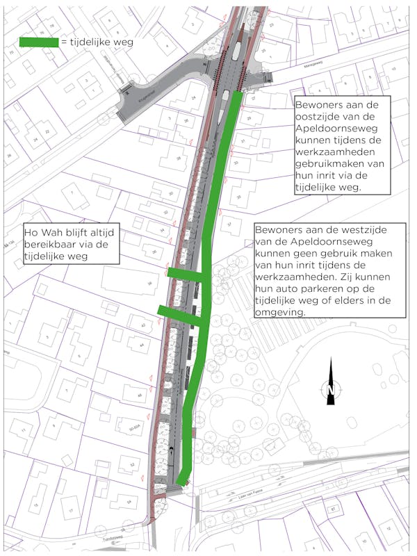 Op bijgevoegde tekening is de locatie van de tijdelijke weg te zien. In de week van 18 mei wordt de tijdelijke weg aangelegd. Eind juni is de hoofdrijbaan weer toegankelijk voor het verkeer. We voeren dan nog wel werkzaamheden uit aan de parkeerplaatsen en voetpaden.