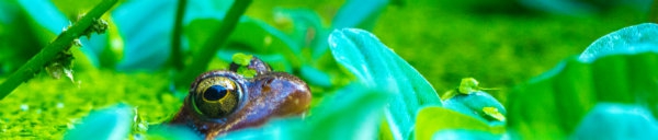 De vorige foto heeft het voordeel dat vrijwel alles in de foto scherp is. Het is bovendien een gemakkelijk te maken foto, want automatisch is dus alles scherp. Ik vind het mooier om een foto over het wateroppervlak te maken en ga dus naast de vijver liggen in een positie, waarin ik vrijwel horizontaal fotografeer. Daarmee vervaagt ook de voor- en achtergrond en is het was lastiger om de kikker zelf scherp te krijgen.