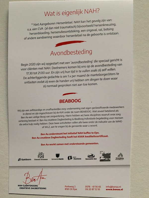 * Ben Aa levert in zijn prikkelarme atelier dagbesteding aan mensen met NAH. Deze vorm van creatieve dagbesteding onderscheid zich doordat het geheel op maat is voor onze cliënten. Daarnaast is gebleken dat elke vorm van creativiteit zoals bij ons gegeven je gezondheid positief bevorderd, zowel fysiek en emotioneel. Even vrij van alle zorgen van alle dag, je bij ons in goede handen.