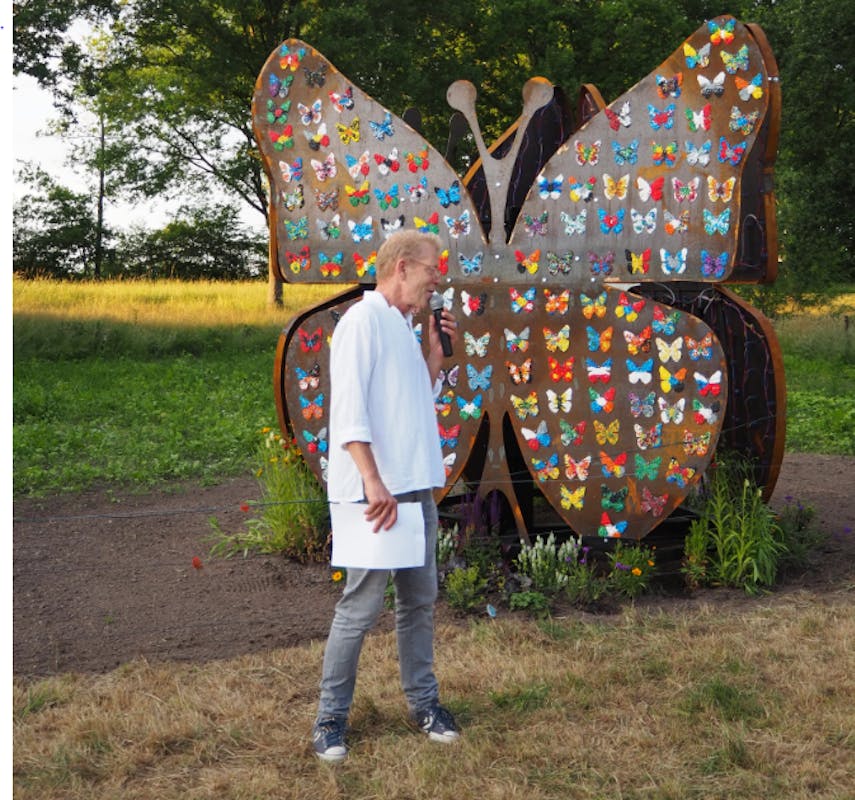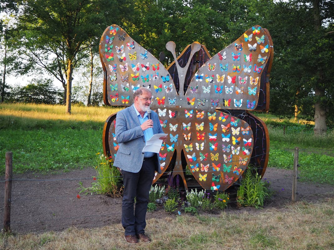 Zaterdagavond 20 juni is het kunstobject ‘De Vlinders’ onthuld. Het staat in de tuin van Hagedoorns Plaatse en ’s avonds is het helemaal een prachtig gezicht als de smartled-lichtjes branden.