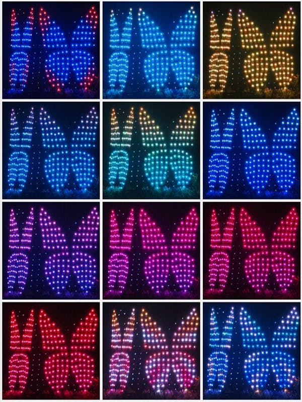 Het kunstwerk bestaat uit 3 metalen vlinders met daarop 426 kleine vlinders die gemaakt zijn van gerecyclede plastic doppen.