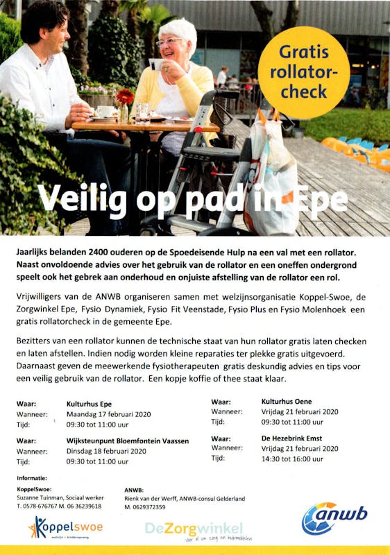 Vrijwilligers van de ANWB organiseren een gratis rollatorcheck in de gemeente Epe. De ANWB werkt daarvoor samen met welzijnsorganisatie Koppel-Swoe, de Zorgwinkel Epe, Fysio Dynamiek, Fysio Fit Veenstade, Fysio Plus en Fysio Molenhoek.