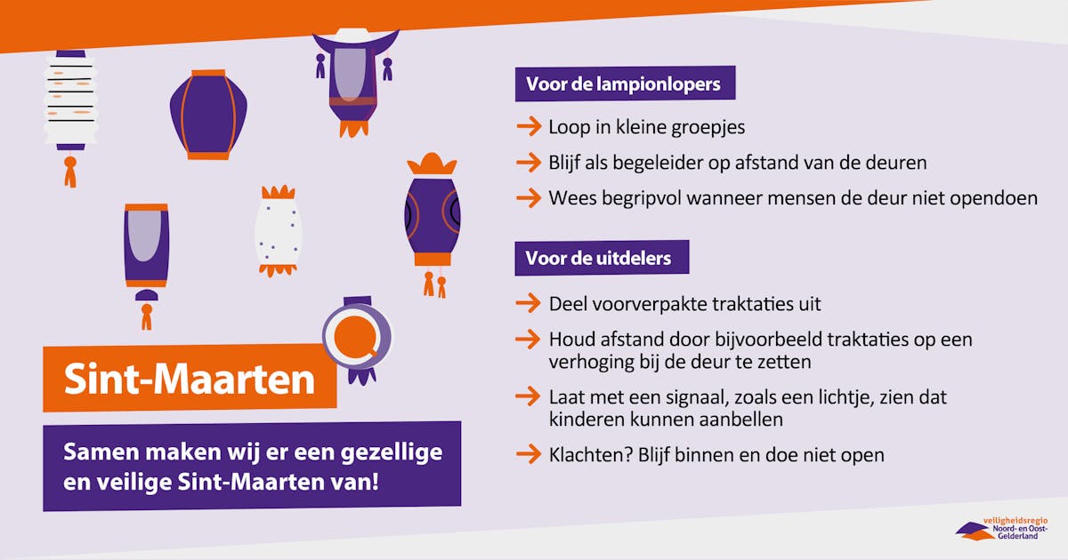 Vandaag 11 november is het Sint-Maarten. Wij wensen alle kinderen die vanavond op pad gaan (en hun ouders of verzorgers) een gezellige en veilige avond toe. Wil jij weten hoe je het veilig kunt houden in deze tijd? Lees de tips van Veiligheidsregio Noord- en Oost Nederland door.