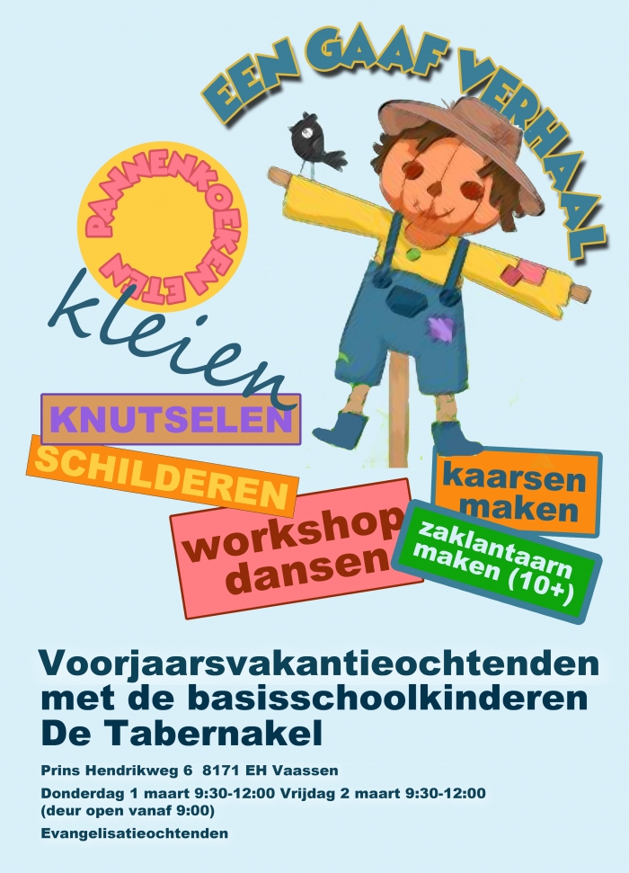 Op donderdag 1 en vrijdag 2 maart tijdens de voorjaarsvakantie worden van 9.30 tot 12 uur weer kinderactiviteiten georganiseerd in De Tabernakel. Deze ochtenden worden georganiseerd door de gezamenlijke kerken in Vaassen. Dit jaar is het Thema “een Goed Verhaal over de vogelverschrikker die andere talenten heeft dan vogels verjagen”