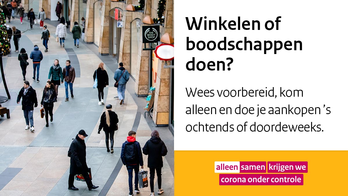Winkelen rond de feestdagen doen we dit jaar vanwege corona anders dan normaal. Ga je winkelen? Wees goed voorbereid, kom alleen en winkel op rustige momenten. Zo spreiden we samen de drukte. Heb je klachten? Winkel dan online.