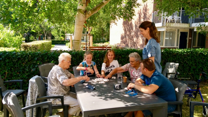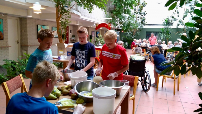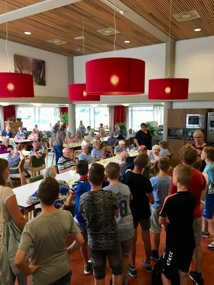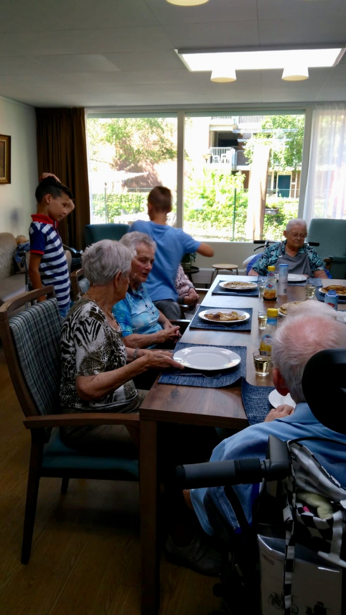 Stichting Present organiseerde een projectdag in zorgcentrum de SPEULBRINK voor de oudste leerlingen van basisschool Anne de Vries uit Epe. In verschillende groepjes werden er activiteiten gedaan door de leerlingen met ouderen. Mijn oudste dochter was erbij en ik was er ook ter ondersteuning en uiteraard ook een beetje in mijn rol als buurtverbinder. Er werd gewandeld, fruit uitgedeeld en vooral veel gepraat met de ouderen. De medewerkers op de verschillende woongroepen vertelden ondertussen enthousiast over hun werk. Ook konden de kinderen een spelletje met de ouderen doen en dat werd erg gewaardeerd! Voor de kinderen was het soms wel even wennen hoe je contact maakt met de dementerende groep. Het doen van een gezelschapsspel brak het ijs gelukkig wel een beetje. Het werd een zeer leerzame ochtend. Het project werd afgesloten met een gezamenlijke lunch met pannenkoeken gebakken door de...leerlingen! IJssalon Rozenboom zorgde voor een lekker verfrissend ijsje als toetje. Groep 8 heeft als verrassing ook nog een lied uit de eindmusical gezongen in de koffiezaal voor een grote groep! Vol van alle indrukken werd er weer teruggefietst naar Epe.