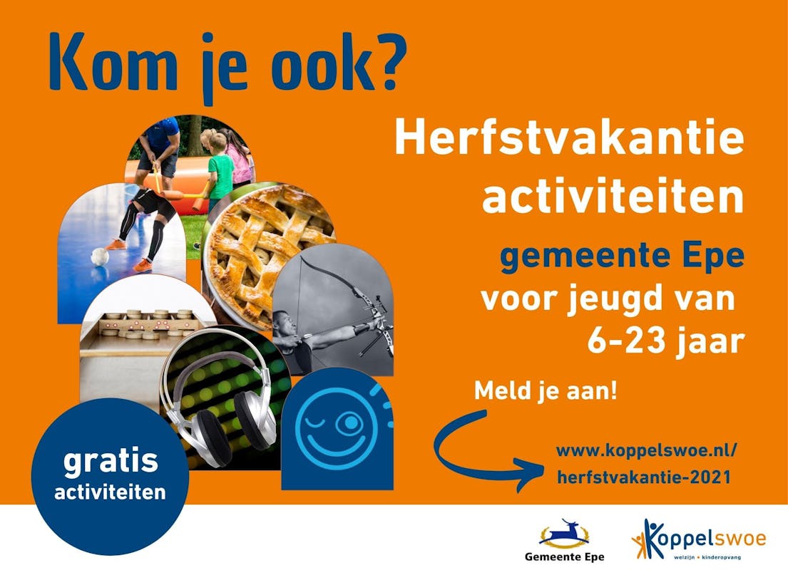 Koppel-Swoe organiseert in samenwerking met gemeente Epe tijdens de herfstvakantie weer leuke en gratis activiteiten voor de jeugd uit de gemeente Epe. In verschillende buurtsteunpunten, veldjes en sportlocaties is er gedurende de hele week wat te doen. Kijk voor het gehele programma op www.koppelswoe.nl. Samen maken we er een leuke en gezellige week van!
