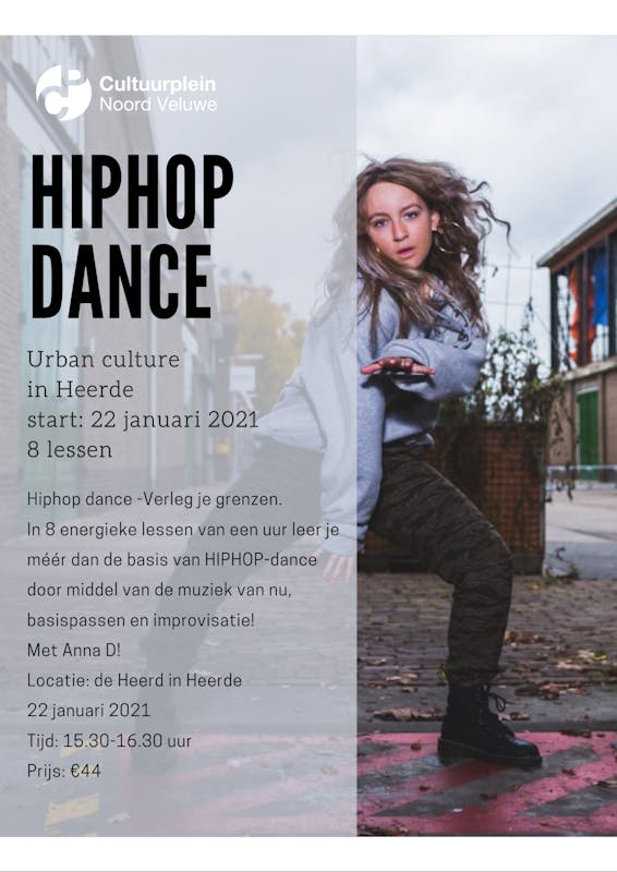 HipHop Dance is een nieuwe dansvorm bij Cultuurplein en wordt gegeven door Anna D. De proefles in december op de Noordgouw was een succes! In 8 energieke van een uur heb je een goede workout en leer je de coolste moves. Het tempo ligt hoog!!! De lessen beginnen op vrijdag 22 januari van 15.30 tot 16.30 uur in de Heerd in Heerde. De kosten bedragen €44.