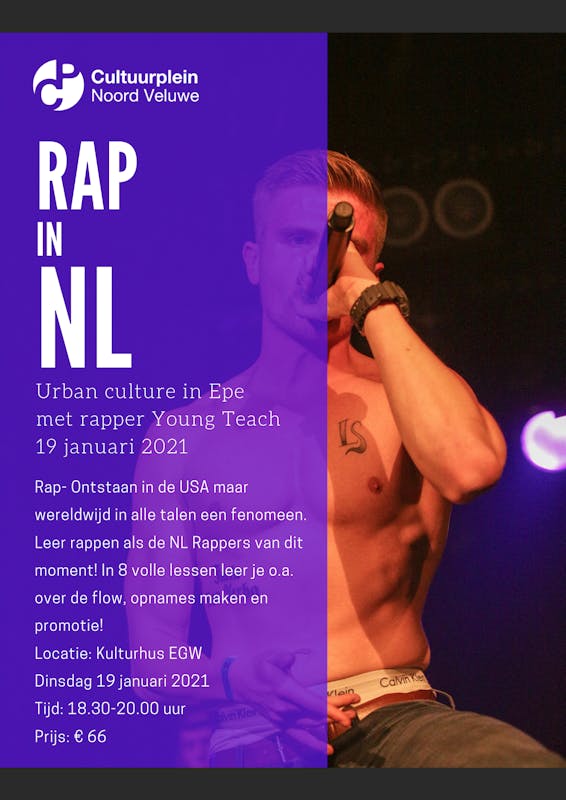 In het nieuwe jaar starten we met twee splinternieuwe cursussen voor jongeren. We starten op dinsdag 19 januari met Rap in NL. Rapper Young Teach gaat met jongeren aan de slag en leert ze van alle over deze muziek stijl. Hoe maak je een goede rap, hoe neem je iets op. Bekijk zijn video kanaal en laat je vast inspireren. Deze cursus van 8 lessen vindt plaats in het Kulturhus EGW in Epe van 18.30 tot 20.00 uur. De kosten bedragen €66.