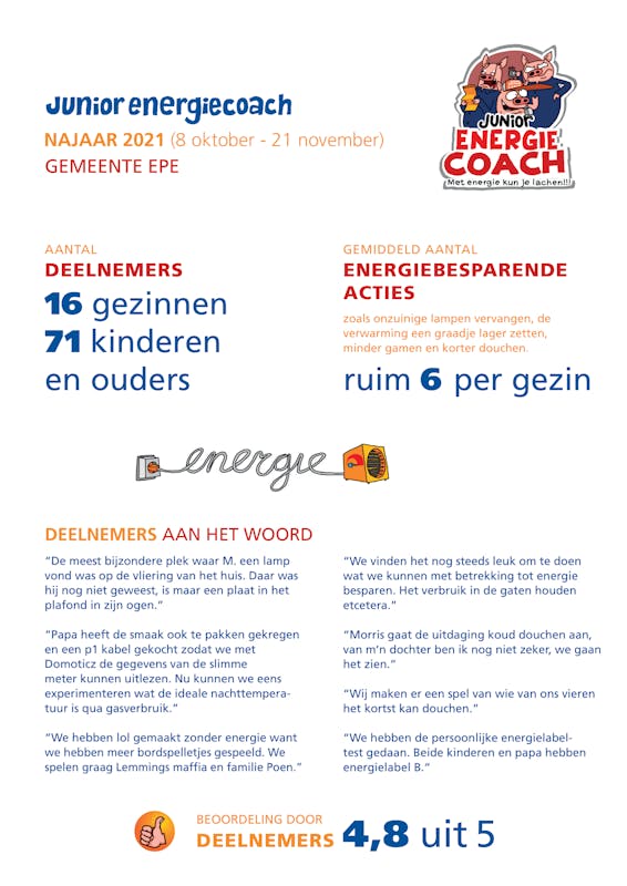In het najaar van 2021 konden gezinnen via gemeente Epe voor het eerst gratis deelnemen aan Junior Energiecoach. Junior Energiecoach is een spel voor kinderen van 7 tot 12 jaar en hun gezin. Vijf weken lang doen zij mee aan verschillende spellen en challenges die te maken hebben met energiebesparing. In onze gemeente ging een groep eerste deelnemers in oktober van start. Wij interviewden de vader (V) en zoon (Z) van Team Electrisch uit Vaassen over hun ervaring met Junior Energiecoach.