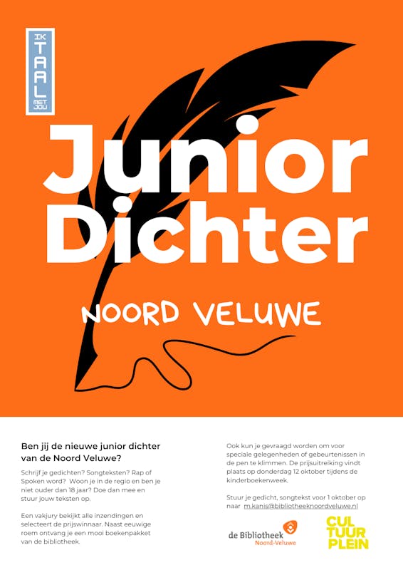 Kinderen en jongeren die van schrijven en dichten houden kunnen meedoen met de verkiezing van de Junior Dichter van de Noord Veluwe. Na de verkiezing van de Dichter van de Noord Veluwe voor volwassenen is het nu tijd voor de dichters in de leeftijd tot en met 18 jaar. Cultuurplein en de Bibliotheek Noord Veluwe gaan samen op zoek. De prijsuitreiking zal plaatsvinden tijdens de Kinderboekenweek. De zoektocht naar de Junior Dichter is onderdeel van het project “Ik TAAL met jou’, een initiatief van Cultuurplein i.s.m. de Bibliotheek Noord Veluwe.