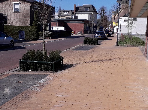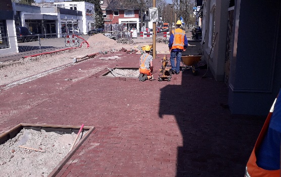 Het noordelijke deel van de Dorpsstraat krijgt nu duidelijk vorm. Je ziet de omtrek van de planten-bakken in de straat. Het straatwerk is bijna klaar en de middengoot vormt een mooi contrast met het wegdek.
