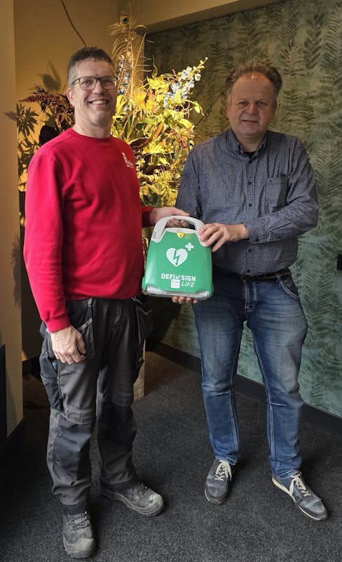 Johan Brendeke, links op de foto en zelf BHV-er bij dit bedrijf, geeft aan dat deze AED de veiligheid van de lokale gemeenschap zal versterken. “Wij zijn lokaal betrokken en op deze manier kun je een positieve verandering teweeg te brengen in je eigen omgeving.”