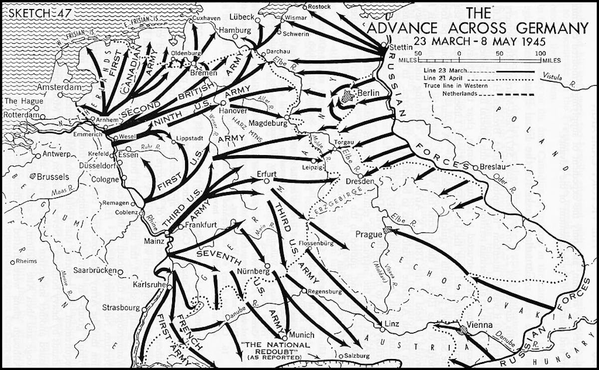 Bij Torgau, een oude residentie van Saksische vorsten ten zuiden van Berlijn, ontmoetten de Russische troepen hun Amerikaanse bondgenoten aan de Elbe. De geallieerde troepen sneden als een warm mes door de boter van de Duitse verdediging, maar ontmoeten telkens weer felle tegenstand van Duitse troepen.