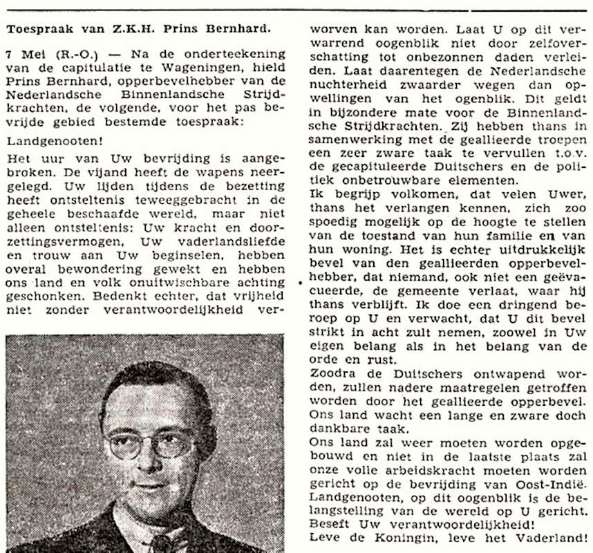 7 Mei (R.-O.) — Na de onderteekening van de capitulatie te Wageningen, hield Prins Bernhard, opperbevelhebber van de Nederlandsche Binnenlandsche Strijdkrachten, de volgende, voor het pas bevrijde gebied bestemde toespraak: