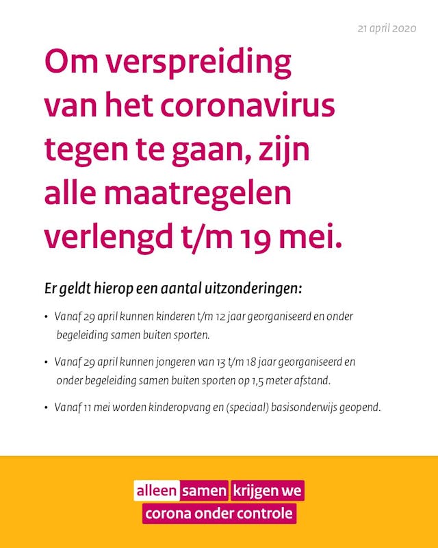 Er is een nieuwe noodverordening van de VNOG. Daarin is de verlenging van de coronamaatregelen t/m 19-05 verwerkt. Meer info in het nieuwsbericht op epe.nl.
