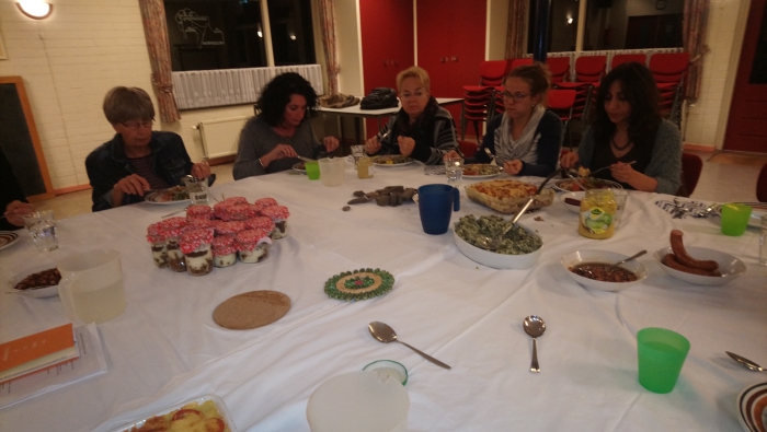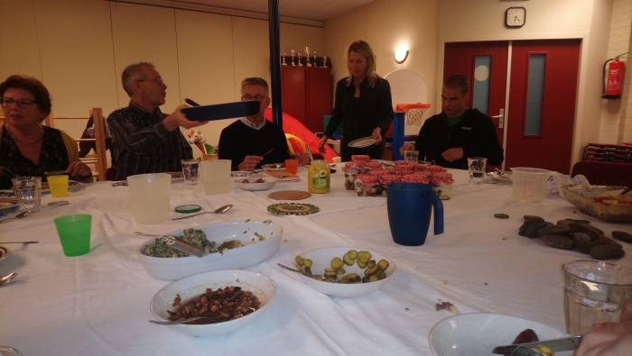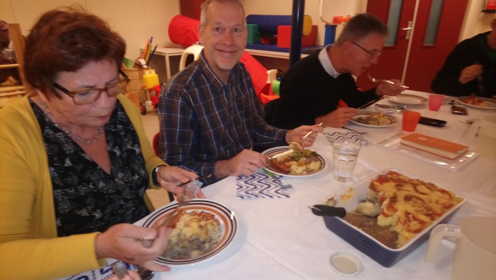 Eens in de zoveel tijd overleggen we samen met alle Buurtverbinders en de Buurtregiseurs. We doen dit ook in kleine groepjes maar hier zijn we dan allemaal samen. Eerst eten we wat, immers samen eten verbroederd. Vandaag stond Stampot op het menu en kregen we de worst van een Vaassense Kennis die op markten en fairs staan De Veluwse Worst en Kaaskraam het toetje kregen we in een jampotje zodat wie er teveel stampot gegeten had um mee naar huis kon nemen. Dat deed natuurlijk niemand want we zijn best wel een beetje toetjes monsters. We hebben gekookt en een stevig overleg gehad in Triton in Vaassen aan de Jasmijnstraat. Maar uiteindelijk zijn we er weer uitgekomen. En let op Marjolijn is echt niet de jongste meer.