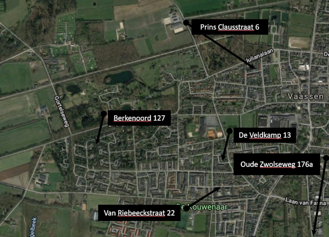 Op deze kaart kun je de adressen weer terugvinden. Het adres aan de Oude Zwolseweg ligt halverwege Apeldoorn, dus ligt niet meer op de kaart.