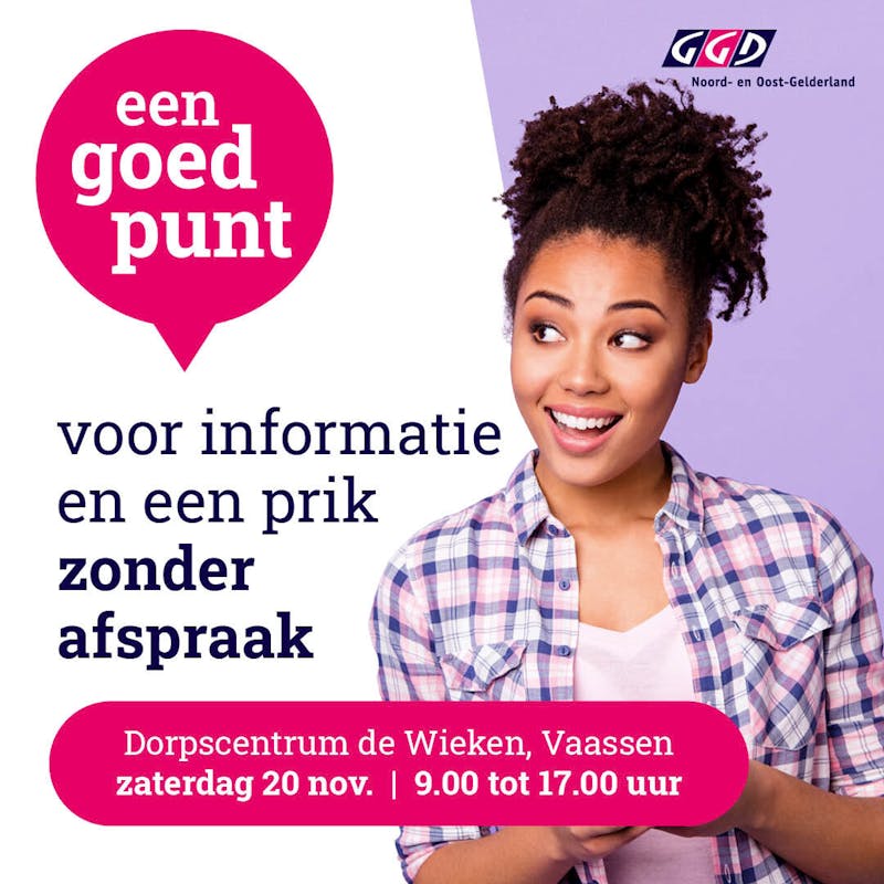 GGD Noord- en Oost-Gelderland is op zaterdag 20 november aanwezig in het Dorpscentrum de Wieken, Vaassen voor extra informatie en voorlichting over het coronavirus en de coronavaccinatie. De locatie is ingericht als tijdelijke pop-up locatie met vrije inloop voor iedereen die vragen heeft of zich wil laten vaccineren zonder eerst een afspraak te maken.