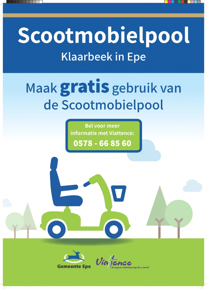 Wilt u af en toe op pad, maar lukt dit niet zonder een scootmobiel? U kunt bij De Klaarbeek in Epe gratis een scootmobiel lenen. Samen met zorgaanbieder Viattence en woningcorporatie Woonzorg Nederland is de gemeente Epe een proef begonnen in de vorm van een Scootmobielpool. Woont u dichtbij woonzorgcentrum De Klaarbeek en wilt u af en toe met een scootmobiel op pad? Dan is de Scootmobielpool mogelijk een uitkomst voor u.