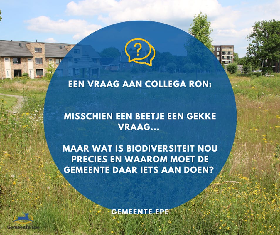 Gemeente Epe zet in op een gezonde leefomgeving. Een gezonde leefomgeving voor mensen en dier. We gaan proberen meer soorten inheemse planten en dieren in deze wijken te krijgen. Het aantal planten- en diersoorten in de wereld en ook in Nederland, is de laatste jaren gedaald. Dat is zonde en de gemeente Epe wil bijdragen om die tendens een halt toe te roepen. Dat kunnen we doen door het beheer van de gemeentelijke plantsoenen en grasvelden aan te passen. We gaan een proef doen in twee wijken; Oosterhof in Vaassen en Vegtelarij in Epe. Wekelijks stellen we de collega's van Groen een vraag over het onderwerp.