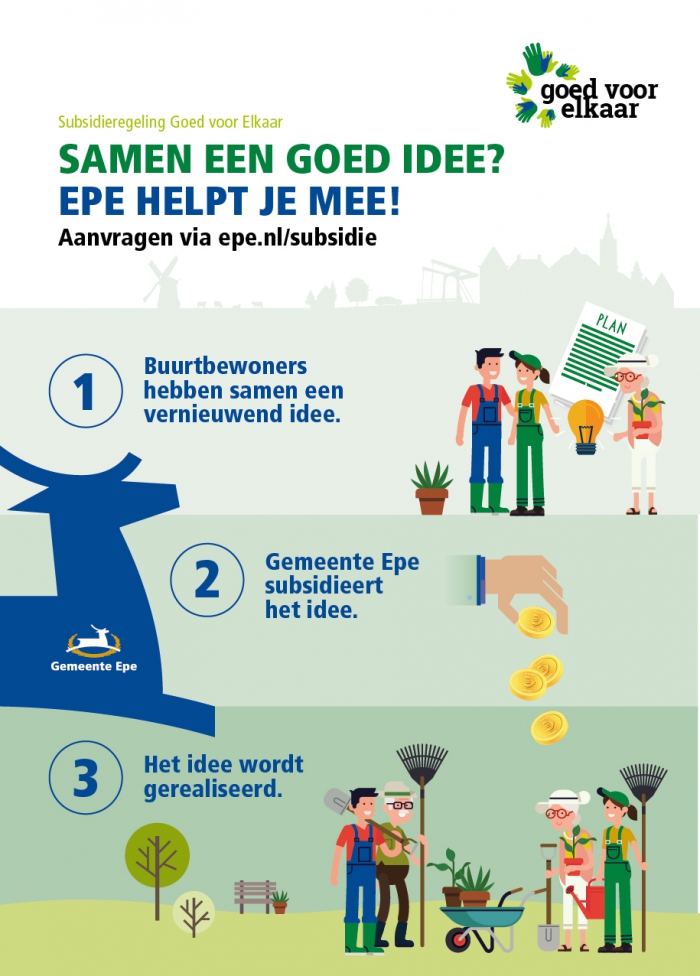 De beste ideeën komen vaak uit de samenleving zelf. Bij de gemeente Epe merken we dat de inwoners steeds vaker zelf het voortouw nemen om activiteiten en initiatieven te organiseren om het leven prettiger te maken. De gemeente draagt een warm hart toe aan de ideeën en heeft de subsidieregeling ‘Goed voor Elkaar’ in het leven geroepen om ook financieel te kunnen bijdragen aan innovatieve bewonersinitiatieven.