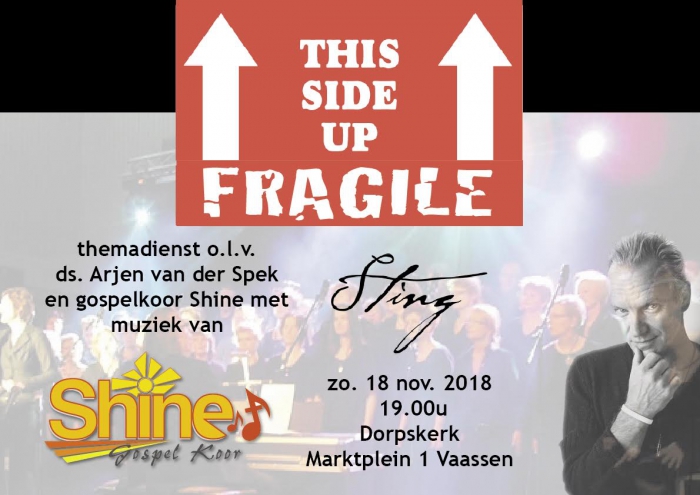 Het belooft een bijzondere bijeenkomst te worden in de Dorpskerk, want er zullen nummers van popartiest Sting worden gezongen. Het thema van deze dienst is 'Fragile'. Het thema verwijst naar de kwetsbaarheid van mensen en de noodzaak om elkaar bij te staan, wanneer de ander hulp nodig heeft. In deze laagdrempelige dienst zullen onder meer prachtige nummers als 'If you love someone', 'Let your soul be your pilot', 'Free free set them free' en natuurlijk het themanummer 'Fragile' langs komen.