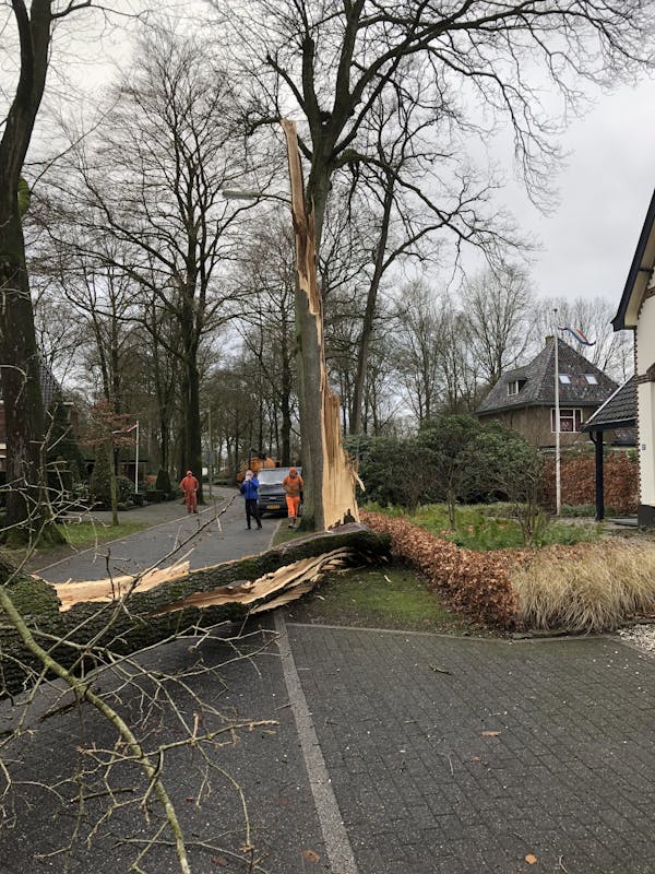 Alleen een deel van de stam staat nog. In de lengte gespleten.
