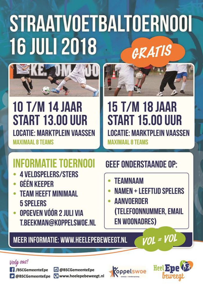 De buurtsportcoaches van Heel Epe Beweegt organiseren op 16 juli een Straatvoetbaltoernooi voor kinderen en jongeren van 10 jaar t/m 18 jaar. In de wedstrijden speel je 4 tegen 4. Er wordt in twee leeftijdscategorieën gespeeld. Leeftijd 10 tot 15 jaar speelt van 13.00 - 14.30 uur. Leeftijd 15 tot 19 jaar speelt van 15.00 - 16.30 uur. Er is maximaal plek voor 8 teams per categorie. Geef je team dus snel op via : teamnaam, namen+leeftijden en de aanvoerder (telefoonnummer, email en woonadres). Meer informatie over het toernooi:
