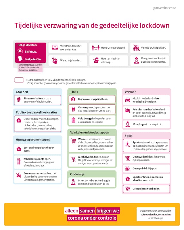 Het kabinet heeft daarom besloten om voor de komende 2 weken, bovenop de huidige gedeeltelijke lockdown, extra maatregelen in te stellen. Deze gelden vanaf woensdag 4 november 22:00 uur tot en met woensdag 18 november.