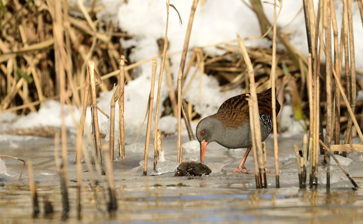 Het liet lang op zich wachten, maar inmiddels hebben we te maken met echt winterweer. Sneeuw en ijs hebben het Gelderse landschap de afgelopen week omgetoverd tot een witte wereld. We konden zelfs even het ijs op! Grotere wateren waren echter maar korte tijd volledig bevroren. En dat is voor moerasvogels als de waterral maar goed ook!