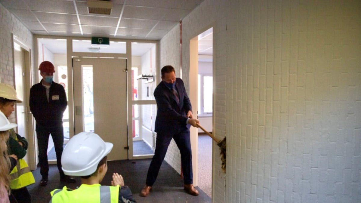 Wethouder Erik Visser verleende op symbolische wijze medewerking aan de start van de sloop. Hij deed dit samen met enkele leerlingen van de Krugerstee.