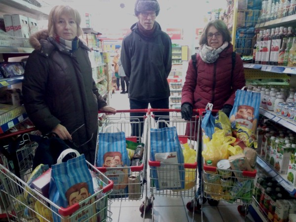 Het was helder vriezend weer en buiten gekomen maakten we een wandelingetje over het leuke centrale plein van deze stad met een groot oorlogsmonument in het midden ervan. Om 9.00 uur kwam Elena en gingen we boodschappen doen voor een vijftal families die we vandaag zouden bezoeken. Omdat de roebeltjes bijna op waren, heb ik ouderwets op de zwarte markt nog wat euro’s gewisseld (1 euro=75 roebel).