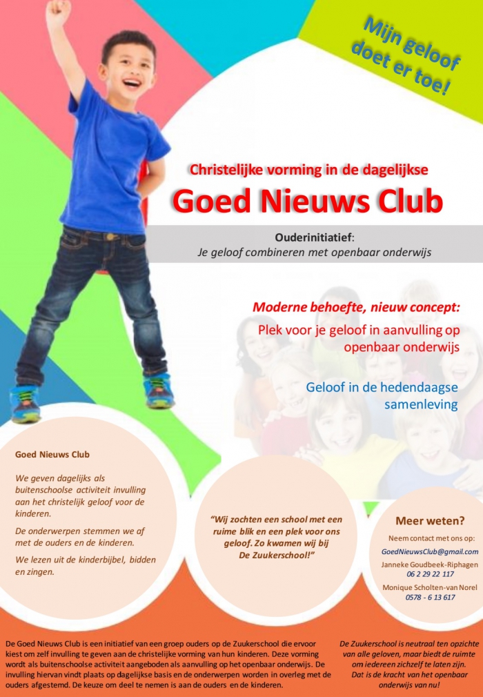Vanaf september start de openbare Zuukerschool met een naschoolse activiteit "de Goed Nieuws Club" een ouderinitiatief als aanvulling op het openbaar onderwijs.