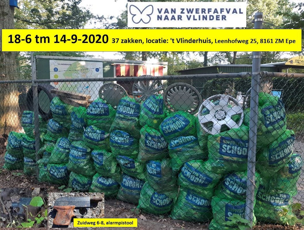 Dellenweg, Zuidweg, Oenerweg, N309 afslag Epe Nunspeet zijn enkele van deze hotspots. Er ligt iedere week weer genoeg om op te ruimen. Op de foto de 37 zakken met afval dat de laatste drie maand uit onze kwetsbare natuur is weg gehaald. Aanstaande zaterdag 19 september gaan we weer beginnen met een nieuwe periode van Zwerfafval opruimen. Er zijn verschillende routes en een kleine 40 mensen helpen mee.